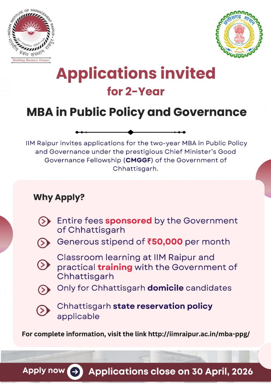 छत्तीसगढ़ के युवाओं के लिए प्रशासनिक गलियारों और नीति निर्धारण की बारीकियों को समझने का एक सुनहरा मौका सामने आया है। मुख्यमंत्री श्री विष्णु देव साय की पहल पर शुरू की गई “मुख्यमंत्री सुशासन फेलोशिप” के तहत अब प्रदेश के प्रतिभावान छात्र न केवल देश के प्रतिष्ठित संस्थान IIM रायपुर से डिग्री लेंगे, बल्कि सीधे सरकार के साथ काम कर जमीनी अनुभव भी हासिल करेंगे।