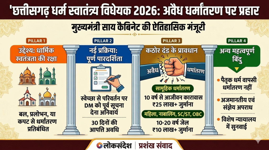 छत्तीसगढ़ में अवैध धर्मांतरण को रोकने और धार्मिक स्वतंत्रता की रक्षा के लिए साय सरकार ने ऐतिहासिक कदम उठाया है। मुख्यमंत्री विष्णु देव साय की अध्यक्षता में आयोजित कैबिनेट बैठक में ‘छत्तीसगढ़ धर्म स्वातंत्र्य विधेयक, 2026’ के प्रारूप को औपचारिक मंजूरी दे दी गई है। इस प्रस्तावित कानून का मुख्य उद्देश्य बल, प्रलोभन या धोखे से होने वाले धर्म परिवर्तन पर पूरी तरह रोक लगाना है।